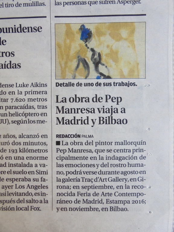 Cultura diario última hora por pepmanresa | Jul 31, 2016 Cultura diario última hora Pep Manresa expone en la Traç d’Art Gallery, en Estampa de Madrid y en Fig Bilbao. Recorte en prensa en el Diario Última hora. Enviar comentario Cancelar la respuestaLo siento, debes estar conectado para publicar un comentario.